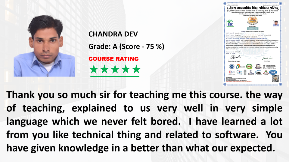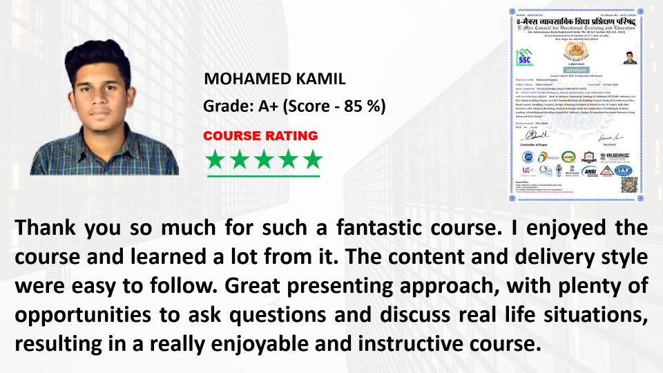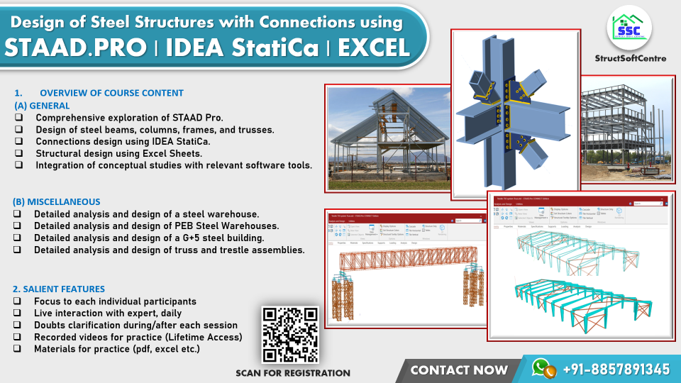 ✅ Intermediate Level: This level focuses on the design of steel structures using STAAD Pro, with an emphasis on the IS-800 code. Participants will validate manual calculations against STAAD Pro results for designing steel beams, columns, and frames, explore detailed design parameters related to IS-800-2007, and learn connection design with Idea Statica, including shear connections, moment connections, and both bolt and weld connections.